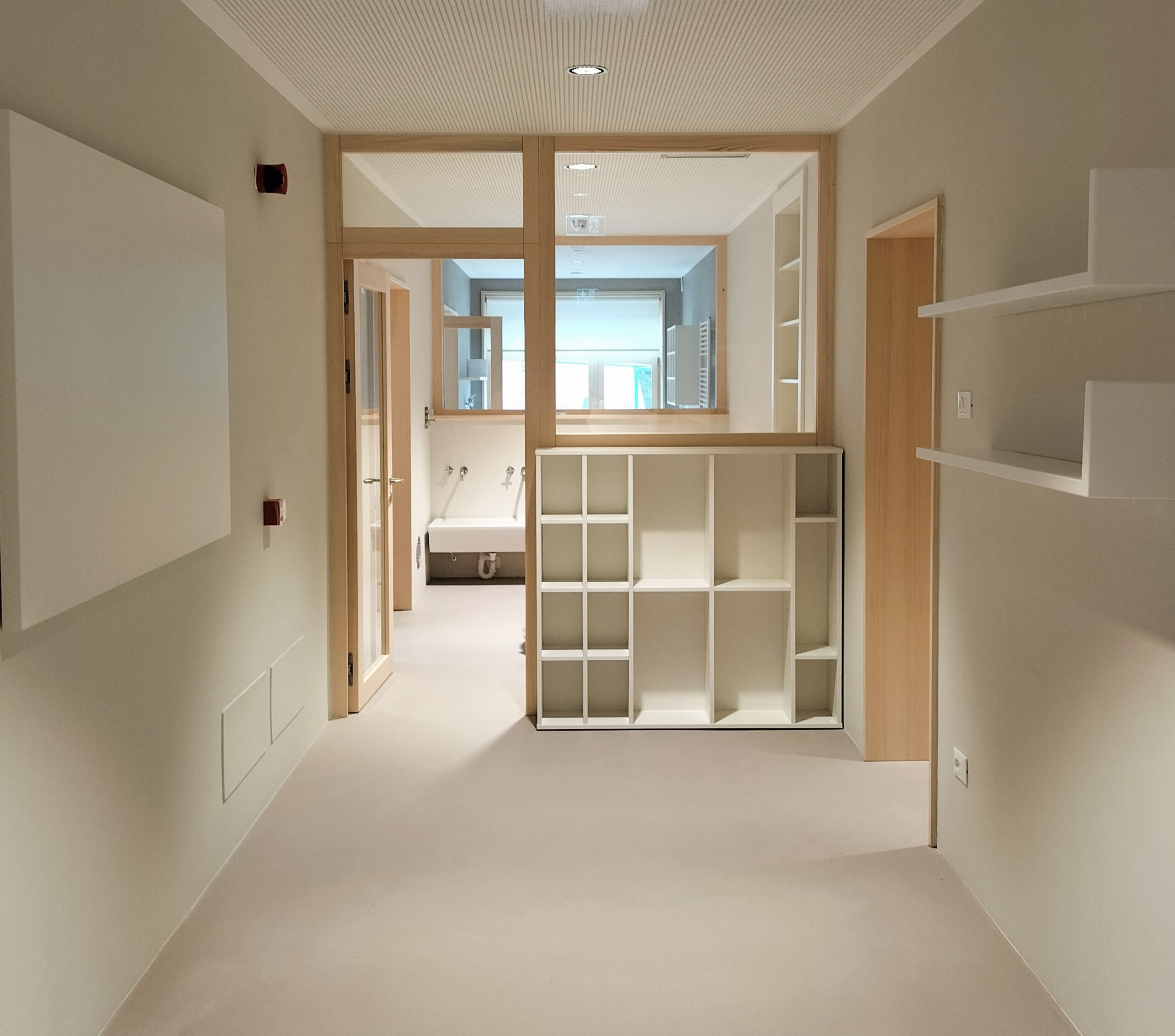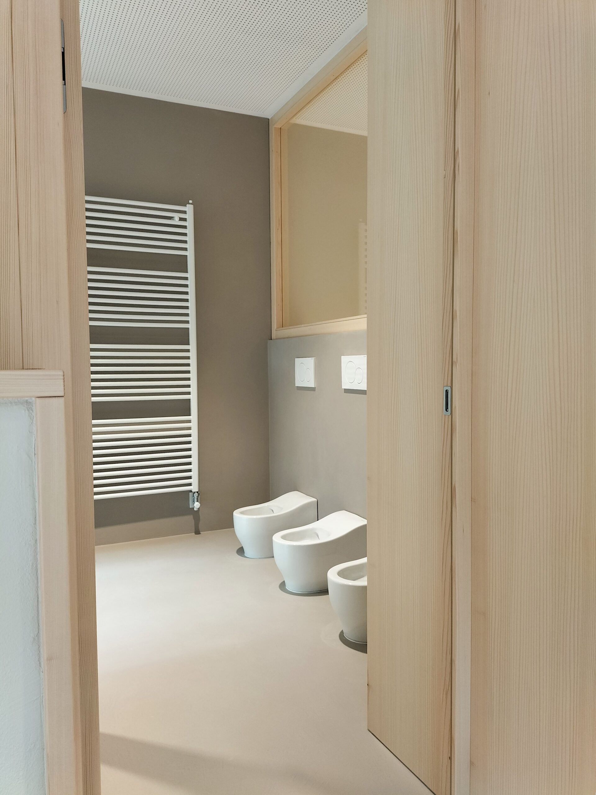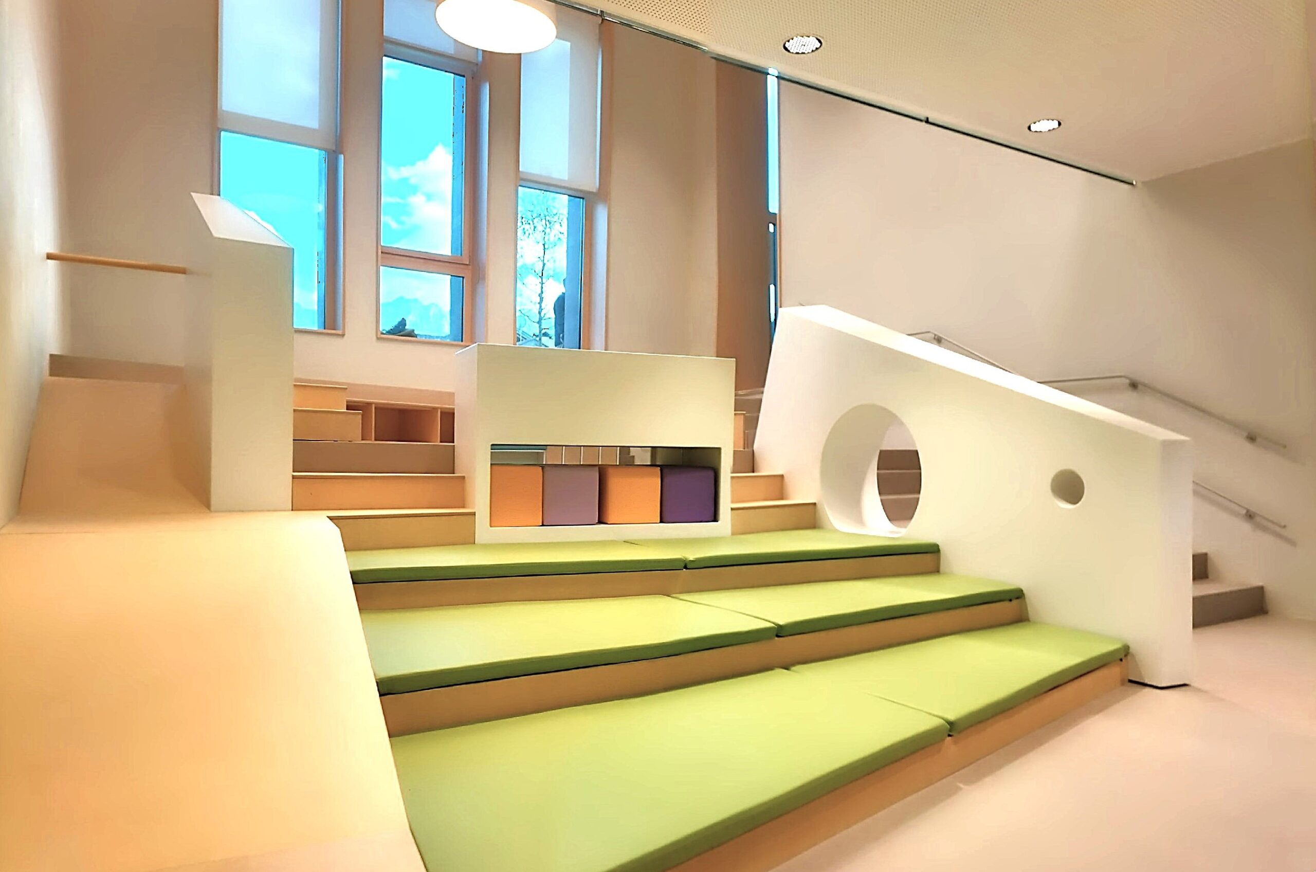 Le aule poste a piano seminterrato hanno ora un collegamento diretto con la zona gioco esterna protetta mentre per quelle a piano rialzato si è migliorata l’accessibilità diretta spostando la scala sul fronte sud.