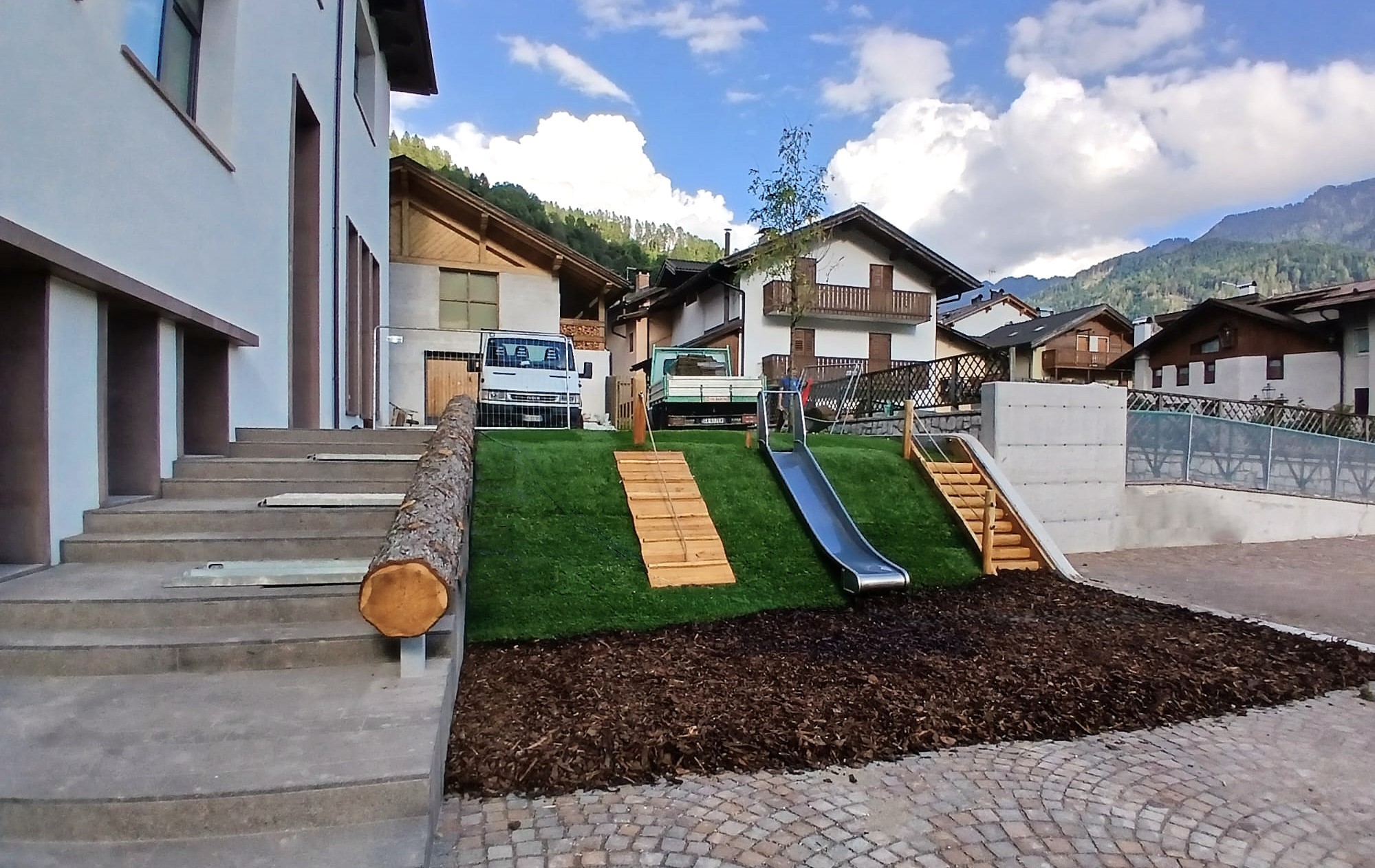 Il nuovo giardino è caratterizzato da una maggiore presenza degli elementi naturali rispetto al giardino precedente : sul nuovo pendio si propone un area con scivoli da pendio per il movimento, una grande sabbiera ed un’area con ghiaia e tronchi sostengono il gioco di manipolazione all’aperto, pavimentazioni in cortecce e tavolati di legno caratterizzano altre zone al fine di offrire spunti liberi per il gioco non caratterizzato dei bambini.
